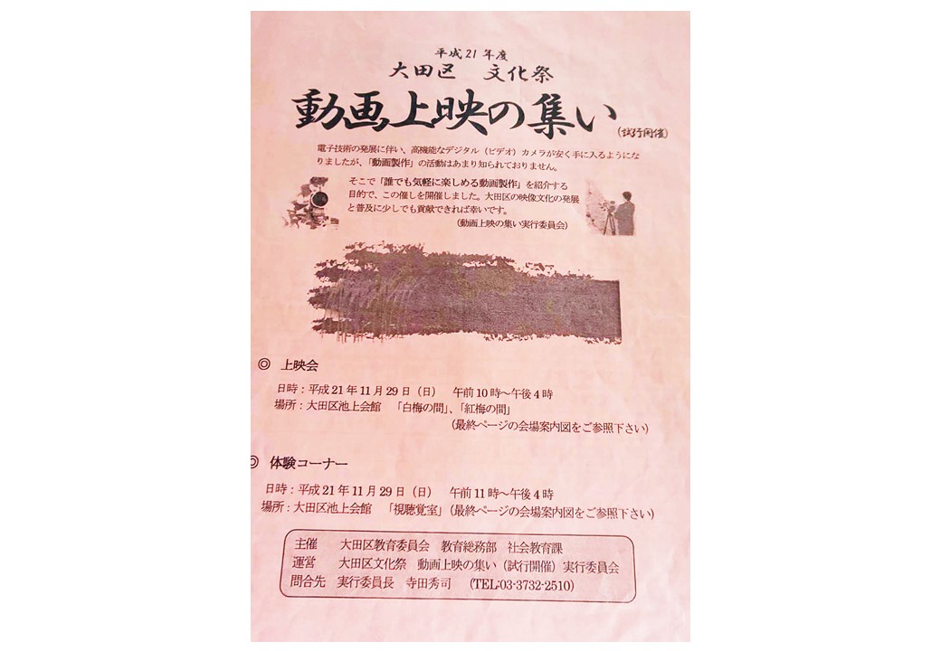 | 2009年 | 故 濱田 智氏の主催によりシルバー人材センターの会議室で活動を開始しました。 ムービーメーカーを活用して写真から動画(フォトムービー)を制作する勉強会を開催しました。 大田区 文化祭の第一回「動画上映の集い」(試行開催)に向けて動画作品を制作し参加しました。 以降、毎年「動画上映の集い」に参加してきました。 |