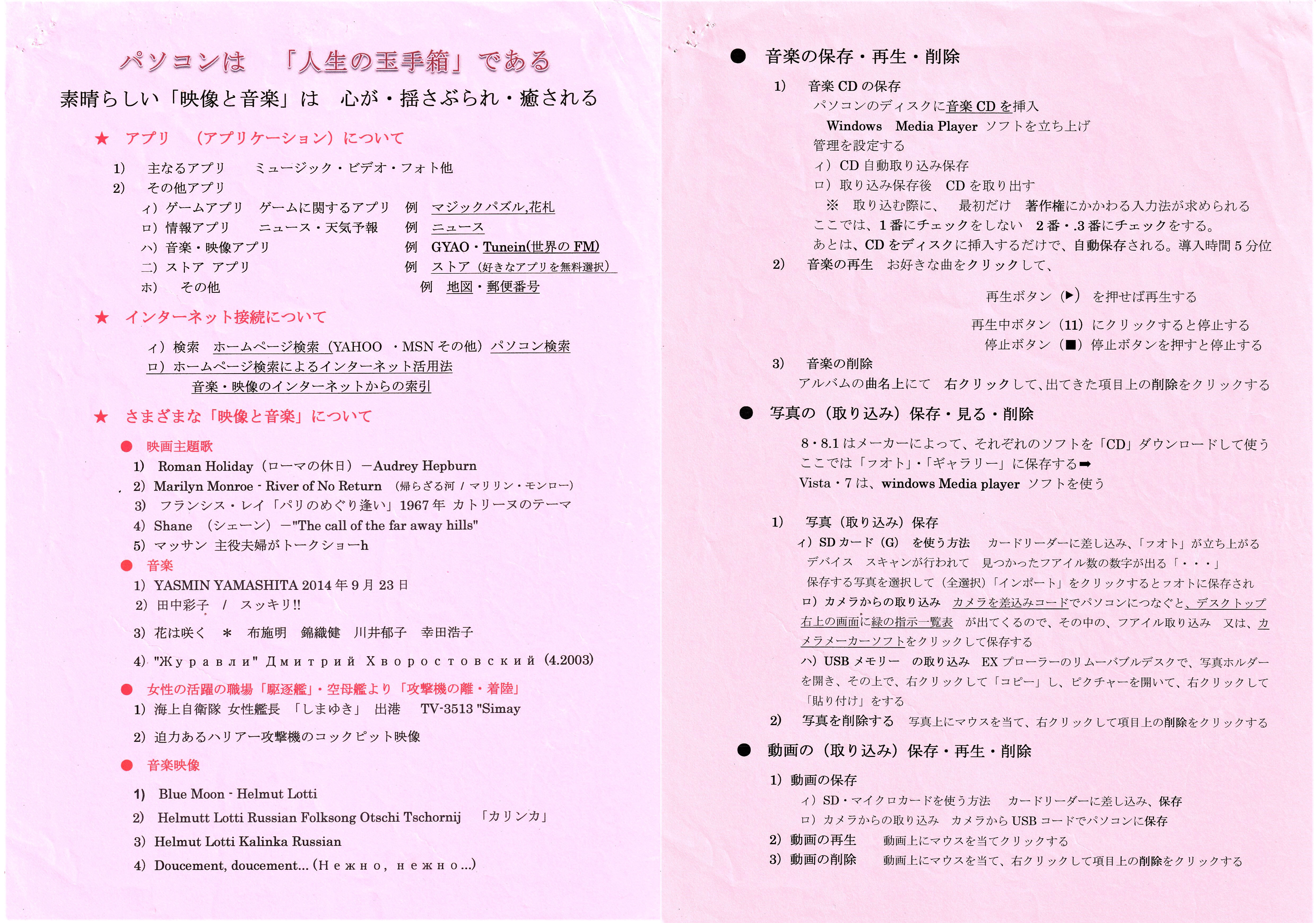 | 2011年 | 開催場所を「こらぼ大森」に移し活動の幅を更に広げました。 東日本大震災の後でもあり、故 濱田氏の「震災が起こっても、このスカイプを使って連絡を取り合って手をつないで行けば混乱は抑えられるし災害は乗り越えられると私は考えているので、ぜひスカイプを通してのコミュニティを作ろう、広げていこう。」との考えからスカイプを中心とした活動を始めました。 この活動から会の名称を「大田スカイプパソコン同好会」としました。 また、パソコンを通じて人生を豊かなものにしたいとの濱田氏の思いから「パソコンは”人生の玉手箱”である」ともお話しされていました。この思いから映像、音楽をテーマとした活動や、インターネットの活用、撮影した写真から動画を制作など幅広いテーマの取り組みを進め、同好会活動と共にパソコン教室も開催しました。 |